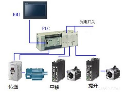 根據(jù)龍門(mén)磁力碼垛機(jī)的作業(yè)流程和客戶應(yīng)用需求,臺(tái)達(dá)整合自有人機(jī)界面、PLC、變頻器、伺服驅(qū)動(dòng)器和電機(jī)等,組成控制解決方案,架構(gòu)如下: