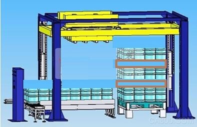 龍門(mén)磁力碼垛機(jī)由水平行走機(jī)構(gòu)、起升機(jī)構(gòu)、載貨臺(tái)及傳送機(jī)構(gòu)、機(jī)架和電氣設(shè)備等基本部分組成。主要作業(yè)流程為:傳送機(jī)構(gòu)將灌裝完畢的罐體輸送到排列機(jī)構(gòu)處,排列機(jī)構(gòu)會(huì)依據(jù)碼垛托盤(pán)的大小將罐體整理成與之對(duì)應(yīng)面積的罐體列隊(duì)。在需要碼垛時(shí),分罐機(jī)構(gòu)會(huì)將整理好的罐體列隊(duì),輸送到磁力碼垛機(jī)磁力吸盤(pán)下。磁力碼垛機(jī)會(huì)將罐體列隊(duì)整體吸起,提升,平移,計(jì)算垛體高度,下降,放罐,回原位等待下一次循環(huán)。待垛體達(dá)到設(shè)定層數(shù)時(shí)發(fā)出完成提示。下圖為龍門(mén)磁力碼垛機(jī)的示意圖: